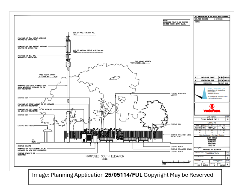 The Cockburn Association objects to this proposal for a telecommunications monopole and associated cabinets on Cluny Avenue, within the Morningside Conservation Area.